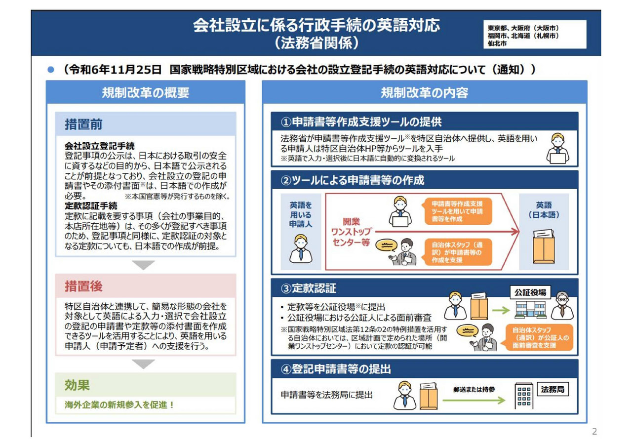 北九州市は令和7年11月17日に開催された国家戦略特別区域会議において、「会社設立に係る行政手続の英語対応(法務省関係)」の活用に係る区域計画の認定申請を行いました。