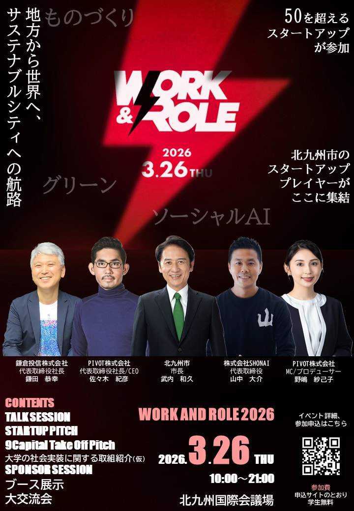北九州市では、スタートアップ関係者が一堂に会するイベント「WORK AND ROLE 2026」を開催します。